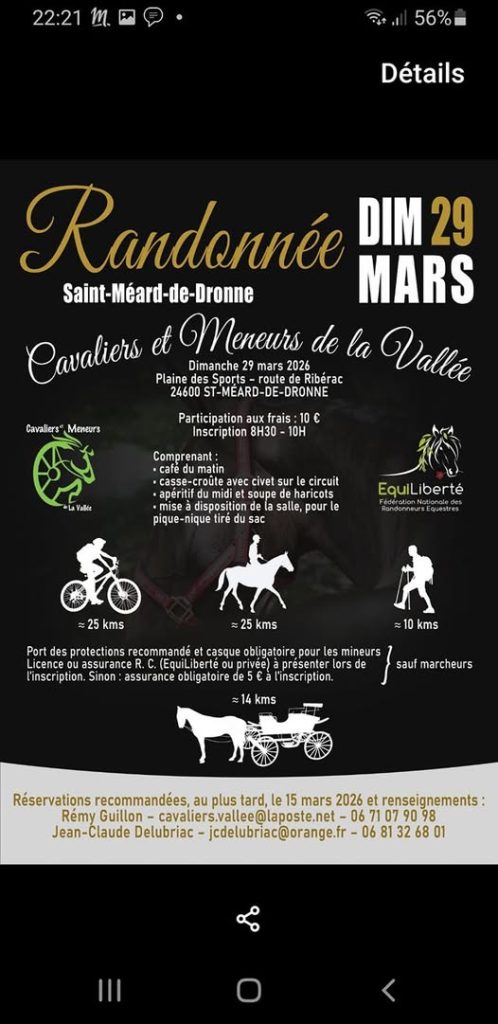 L’association des « Cavaliers et Meneurs de la Vallée » organise, le 23 mars 2025, sa traditionnelle randonnée du printemps au départ du magnifique site de la Plaine des Sports de la Tour, route de Ribérac à Saint-Méard-de-Dronne (24600). Celle-ci comporte 3 circuits : 25 km pour les Cavaliers et VTT, avec un raccourci, 14 km pour les Attelages et 10 km les Marcheurs (distances approximatives).