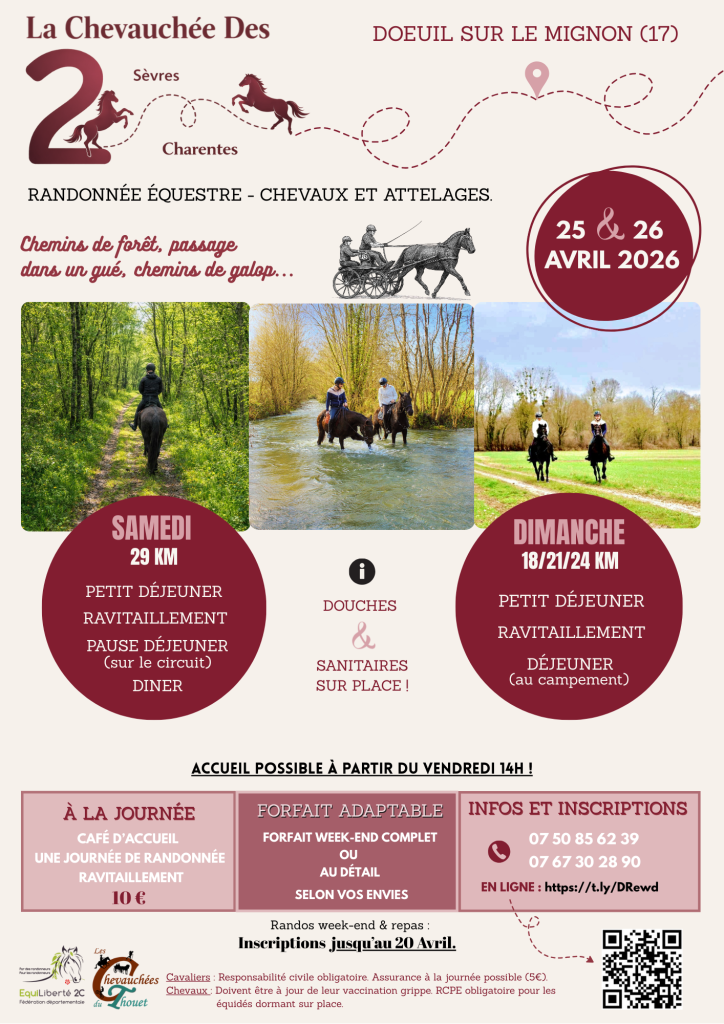 « Tous les Évènements WE La Chevauchée des 2 (17) 25 avril 08:00 – 26 avril 17:00 fb le bourg Doeuil sur le Mignon, 17330 + Google Map Ajouter au calendrier Google Agenda iCalendar Outlook 365 Outlook Live
