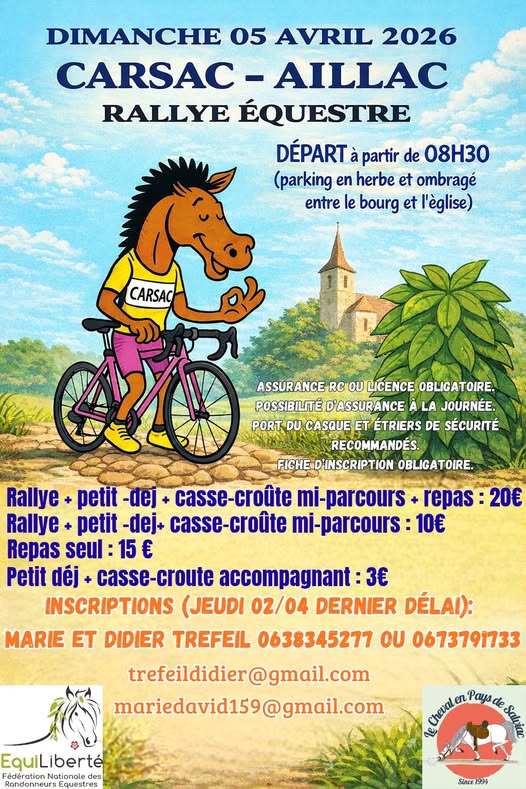 le bourg Carsac-AillacOrganisé par Didier et Marie, dans le cadre des activités de l'association du Cheval en Pays de Salviac. Entre Dordogne paisible et collines verdoyantes, un parcours d’environ 20 km pensé